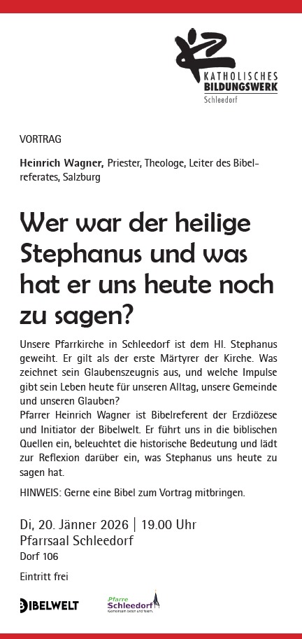 Einladung zum VortragBirgit Frauenschuh14. Januar 2026Feste, Pfarrinformation Wer war der Heilige Stephanus und was hat er uns heute noch zu sagen?Ein besonderer Vortrag im Zuge von unserem Pfarrprojekt hl. Stephanus mit Heinrich Wagner (Priester, Theologe, Leiter des Bibelreferates Salzburg)